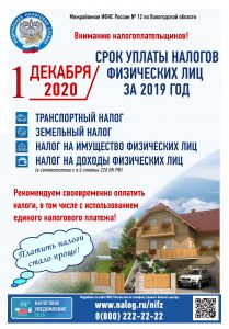 Межрайонная ИФНС России № 12 по Вологодской области сообщает: срок уплаты транспортного налога, земельного налога и налога на имущество физических лиц за 2019 год – не позднее 1 декабря текущего года. Рекомендуем своевременно произвести оплату налогов, в том числе с использованием единого налогового платежа. Видеоролик здесь