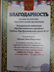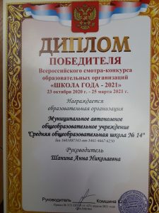 Коллектив МАОУ «СОШ № 14» во главе с директором Шаниной Анной Николаевной стал победителем во Всероссийском смотре-конкурсе образовательных организаций «ШКОЛА ГОДА — 2021», проходившем с 23.10.2020 по 25.03.2021. Поздравляем и желаем дальнейших успехов!